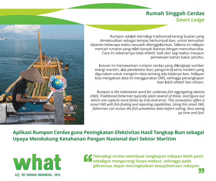 Rumpon adalah teknologi tradisional karang buatan yang dimaksudkan sebagai tempat berkumpul ikan, untuk kemudian dipanen beberapa waktu sesudah ditenggelamkan. Inovasi ini menawarkan rumpon cerdas yang dilengkapi sumber energi mandiri, alat pendeteksi ikan, pengontrol serta modem yang digunakan untuk mengirim data tentang ada tidaknya ikan.