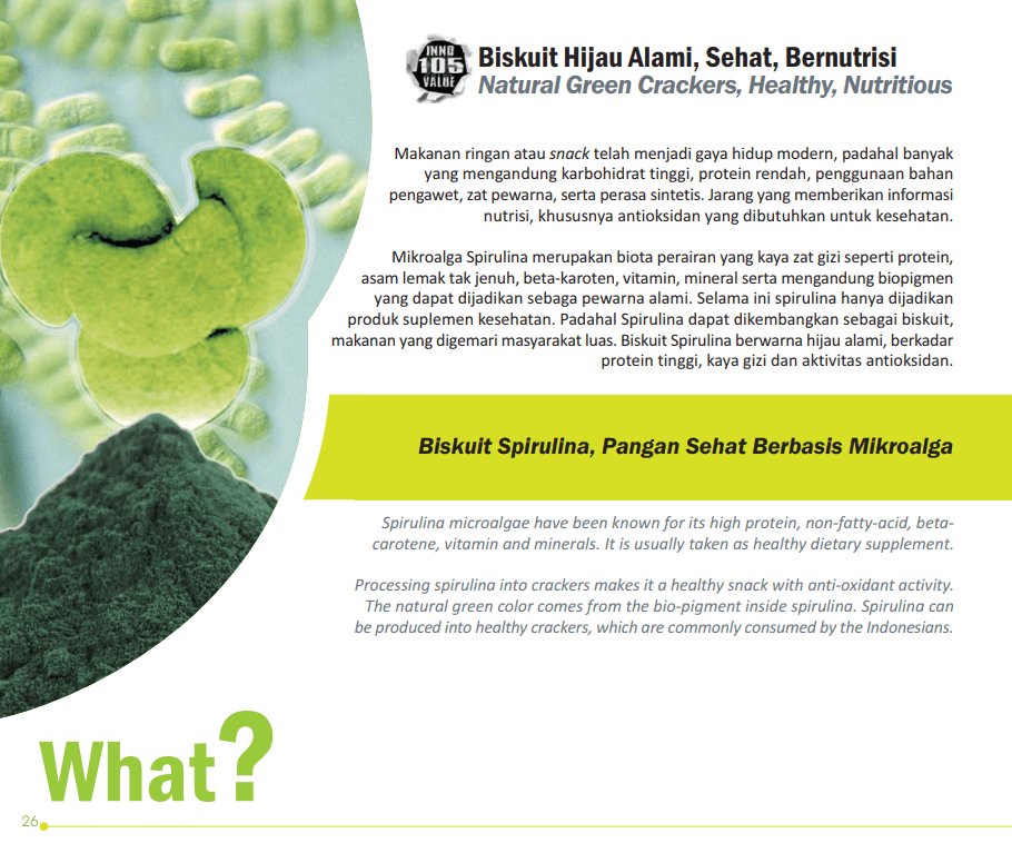 Makanan ringan atau snack telah menjadi gaya hidup modern, padahal banyak yang mengandung karbohidrat tinggi, protein rendah, penggunaan bahan pengawet, zat pewarna, serta perasa sintetis. Mikroalga Spirulina merupakan biota perairan yang kaya zat gizi seperti protein, asam lemak tak jenuh, beta-karoten, vitamin, mineral serta mengandung biopigmen yang dapat dijadikan sebaga pewarna alami.